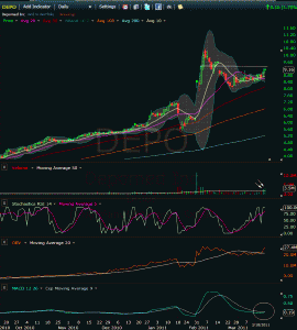 HYC – above 11.70 . Traveling up the channel nicely. I’m looking for a break above horizontal resistance or, if it breaks down, we’ll need to look for support on the trendline (about 10.50).