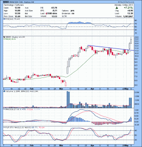IMMR One of the trade I took on yesterday 5/03/13. Stock had earning on 05/02. Next morning it gapped up over the flag. For this type of trading I usually use the first orderly pullback to establish a position.