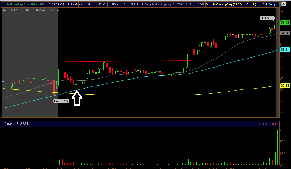 So this morning we woke up to a huge gap up in the markets. How I usually play a stock like that is oversold like this is wait for it to open completely out of the lower bollinger band and then take the trade as it moves red to green. In this instance.. market gapped up huge on us and LNDK ran up 2dollars in one candle right out of the gate. This tells you that there is interest and it is most likely time for the stock to re-gain some of those losses. At this point the stock has accumulated huge short interest and can squeeze 4-5 bucks fast. So, when this happens you can’t chase the gap up.. instead you wait for the stock to pullback to support and buy the intraday dip. I bought the stock on a dip to 60.9 which was the premarket support area and the area that the stock opened on the day. The stock acted well all morning and continued to ride up the moving averages. Once lunch hour was over.. this is the time that you expect the stock to make a move. Stock broke intraday at 62.5 right on cue of the 1pm move. (see intraday chart below) Huge volume started to pour in. This is the spot that you add more for an intraday daytrade. Once the stock breaks intraday.. you know you are in for a big squeeze, as all the shorties have their stops set at this level. I sold 1/2 my position into this intraday squeeze level at 63.2. Stock continues to run rest of the afternoon and closed on highs of almost 66 bucks. I overnighted 1/2 position since the stock closed right on its highs. As long as there are no shenanigans.. this one should gap in the morning.