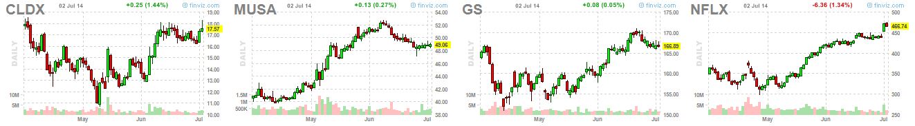 MUSA is still near entry level, as is GS. NFLX started a pullback from breakout. I will watch this one closely. The long tail at the top of the range in CLDX suggests it might pullback.