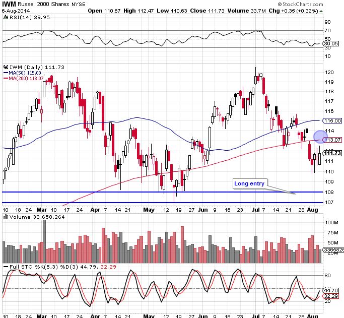 IWM again was a little stronger than SPY. As with SPY, I am looking to short on a low volume bounce and enter on a down move to around $108. Notice how the IWM has bounced in the past at this level (arrows on chart).