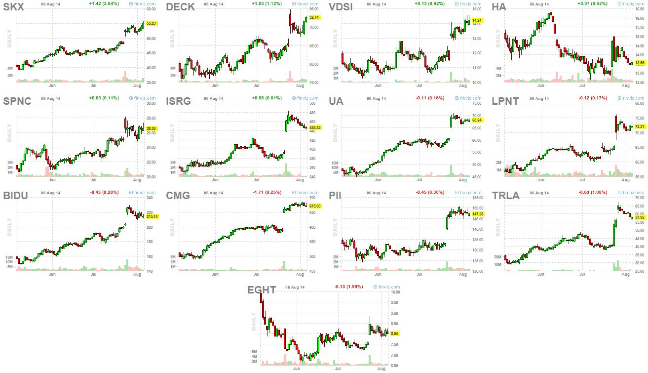 EGHT, LPNT, UA, ISRG and BIDU are all near entry level on slight pullbacks.
