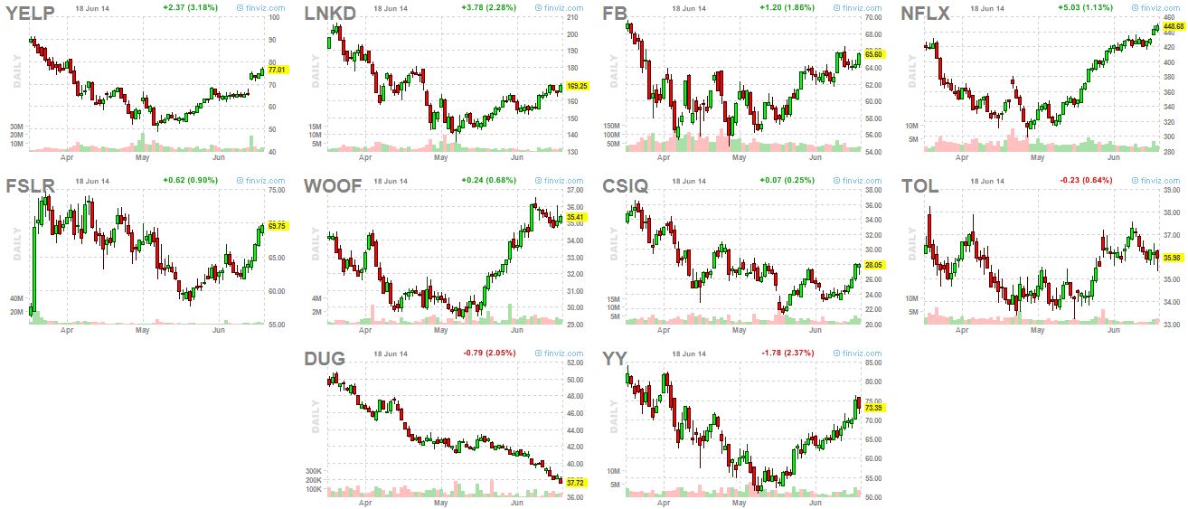 I am still holding a half position in YELP. It closed at $$77.01, so I moved my stop just under today’s bar at $73.90. Leaving it at $70 leaves to much on the table if price dips.