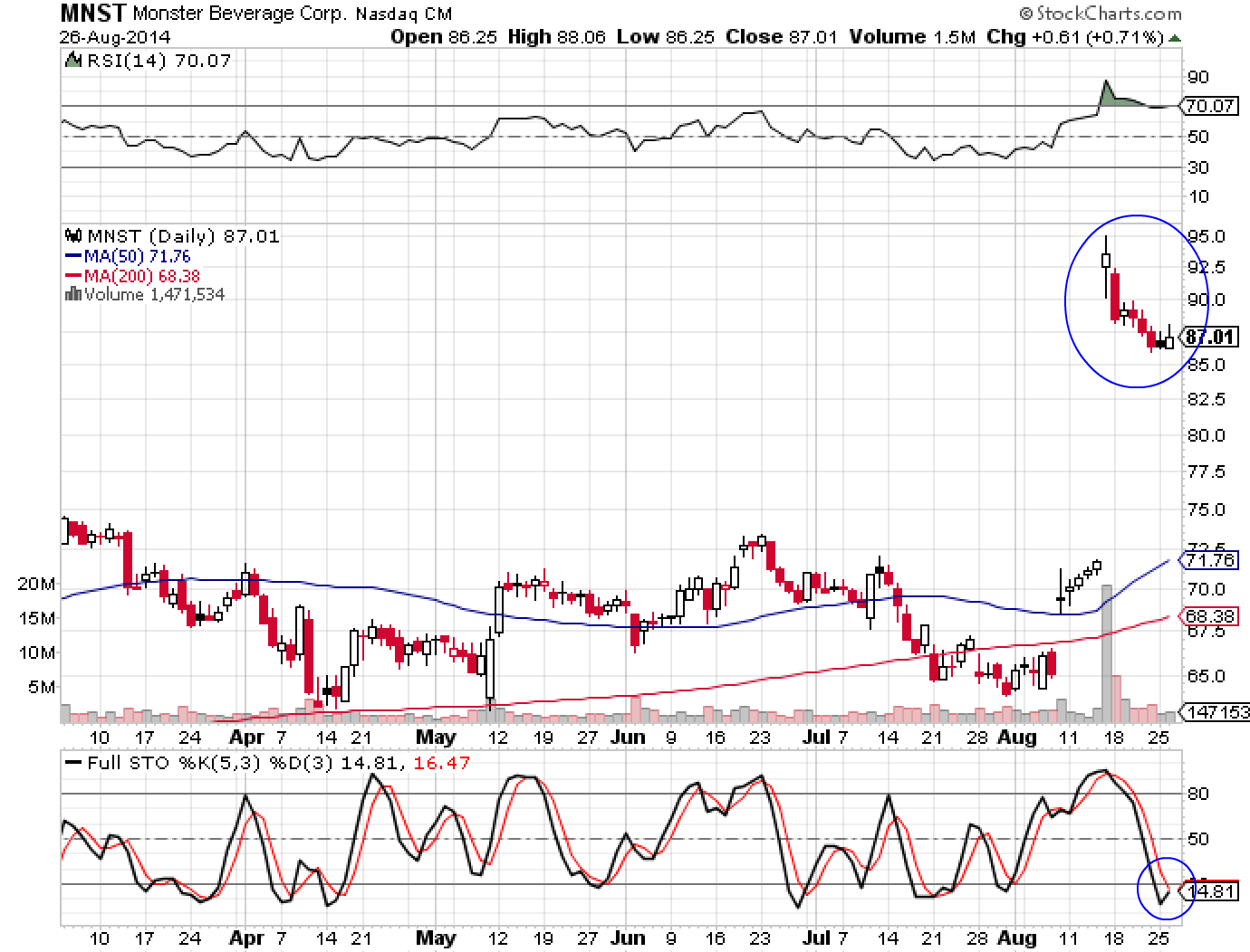 MNST broke out strong with a huge gap and now has the start of that rounded pullback pattern we saw in TWTR. These are always tough because the big gap and lack of support levels makes it tough to find a clear pullback zone. Entry here with stop $84-85. Target $94-95.