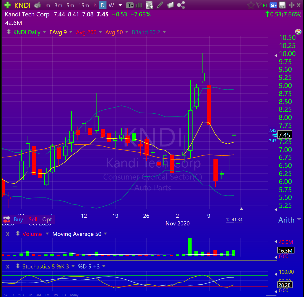 In this example of KNDI, you can see the stock closed at 7.85, so thats the mark you are eyeing for the red to green move. You get that initial washout in the morning where the stock goes red. The dip then gets bought and you start watching for the stock to approach your mark. As soon as the stock goes green on the day, thats your entry. Remember red to green moves are very fast.. so you immediately begin to scale out as the stock pops.