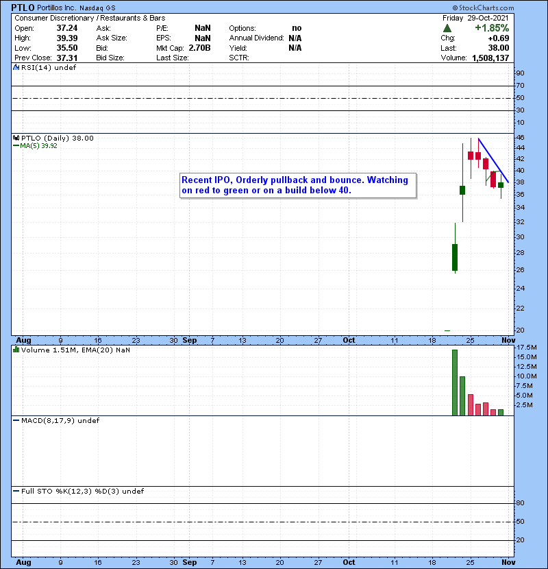 PTLO Recent IPO, Orderly pullback and bounce. Watching on red to green or on a build below 40.
