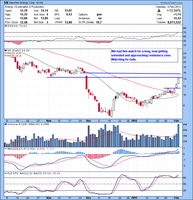 So now we are approaching the overhead resistance of the range, it will be interesting to see if the rips get faded again or we finally break out of the range. Some nice plays from the watch list shorting bio tech names like ISIS, JUNO, KITE and long oil names like LNCO BCEI and SM.
