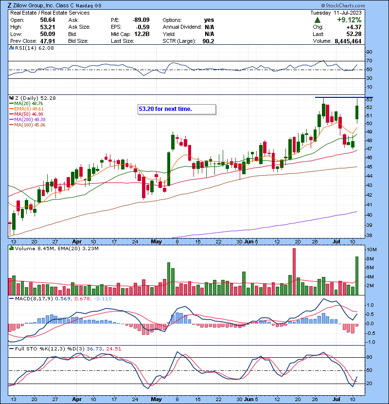 Z had a good day today as the daily chart broke out. Low of the day was 29.60. I was watching it in the afternoon today as it was making new highs for a trade either long or short.. I noticed as price was making new highs to 33.37, lagging indicators such as MACD/CCI was not confirming the price move. That usually is a recipe for a pullback setup for quick day trade.after a big intraday run. Click on the 5 minute chart to see how it played out.